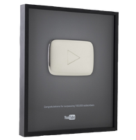 The award consists of a flat silver trophy in a metal casing and a youtube logo symbol, as well as featuring the creator channel name's embossed on it, along with the message congrats for surpassing 100,000 subscribers. the award is also the smallest in.